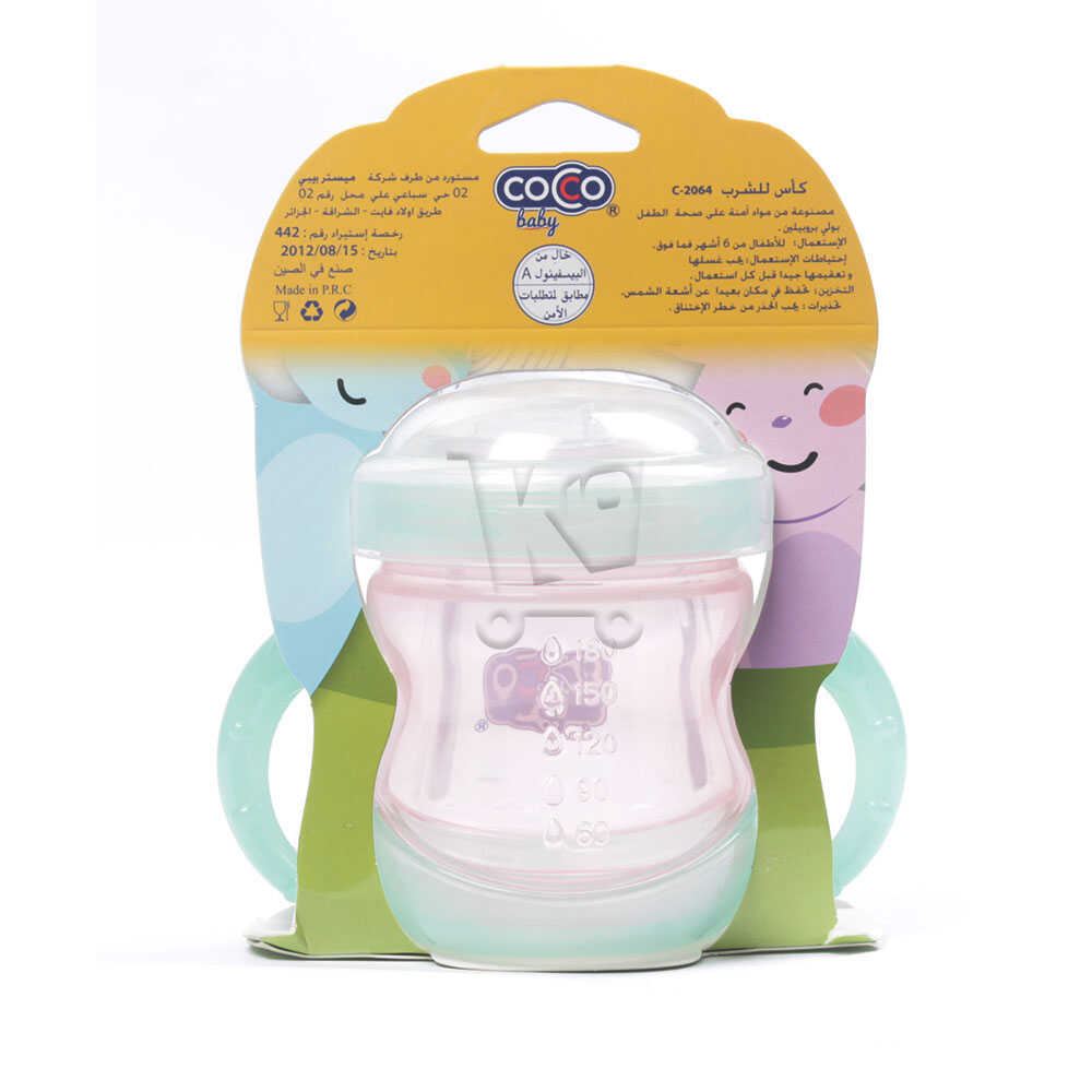 Tasse d’apprentissage avec bras, bec en silicone souple et une valve anti-fuite.