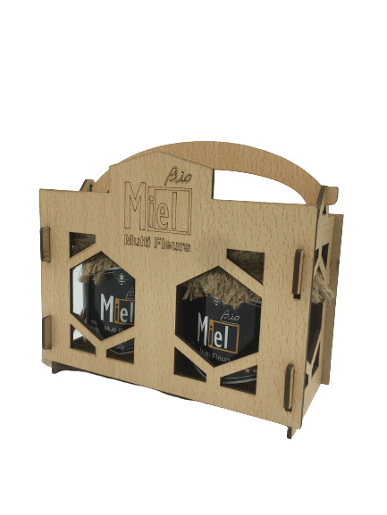 Un coffret en bois qui comporte 2 pots de miel multi fleurs , des pots en verre de 250 g.
