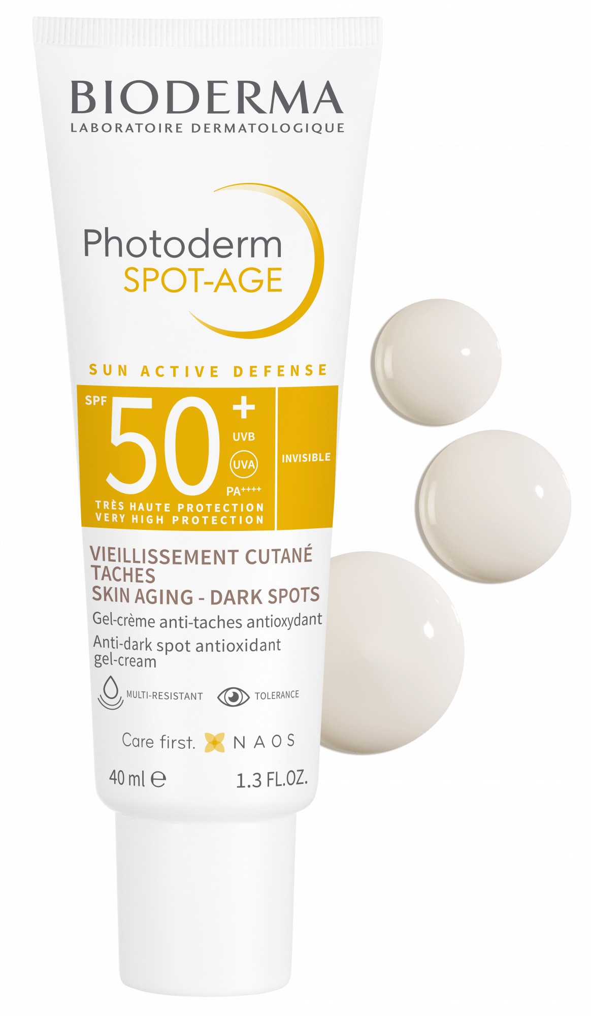 Bioderma crée Photoderm SPOT-AGE SPF 50+ qui associe le pouvoir de 3 actifs reconnus par les dermatologues [Vitamine C – Vitamine E – Centella asiatica] et de filtres solaires pour une protection large spectre (UV – Lumière Visible – Infrarouges) et crée un soin qui prévient et favorise la réduction des signes visibles du photovieillissement (taches, rides, perte de fermeté).
