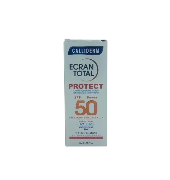 Calliderm Écran Total Protect SPF50+ est une crème solaire visage à très haute protection conçue pour protéger efficacement la peau des rayons UVA et UVB, tout en assurant un confort optimal au quotidien. Elle combine une action hydratante à une barrière photoprotectrice puissante, le tout dans une texture non grasse et non collante, parfaitement adaptée à tous les types de peaux, même les plus sensibles.