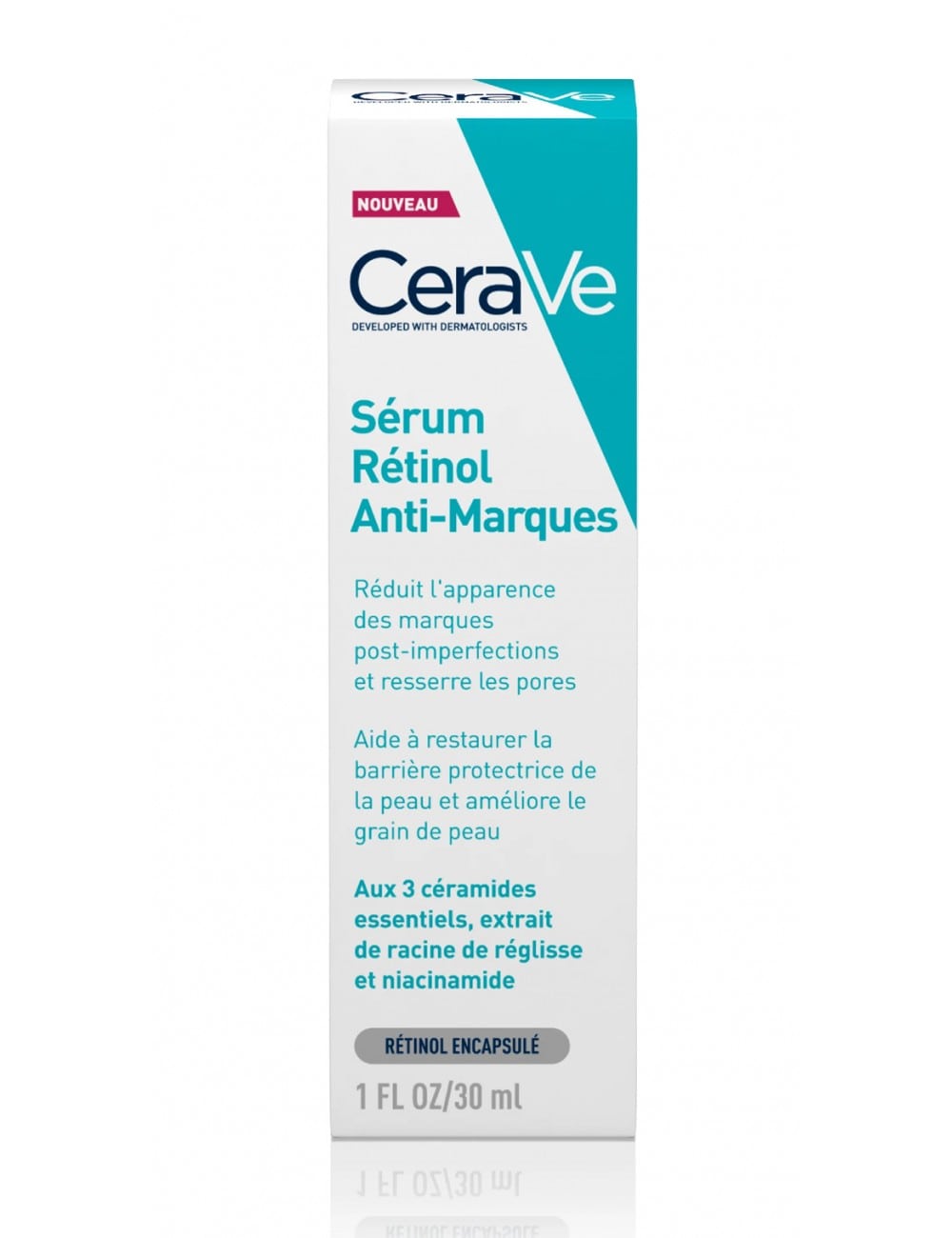 Développé avec des dermatologues, le Sérum Rétinol Anti-Marques CeraVe aide à réduire l’apparence des marques post-imperfections, des pores et lisse et améliore le grain de peau. Formulé avec 3 céramides essentiels, du Rétinol encapsulé, un ingrédient reconnu pour accélérer le renouvellement cellulaire, de l’extrait de racine de réglisse, mais aussi de la niacinamide et de l’Acide hyaluronique pour hydrater et apaiser la peau. La technologie MVE assure une diffusion prolongée des actifs pour une hydratation continue.