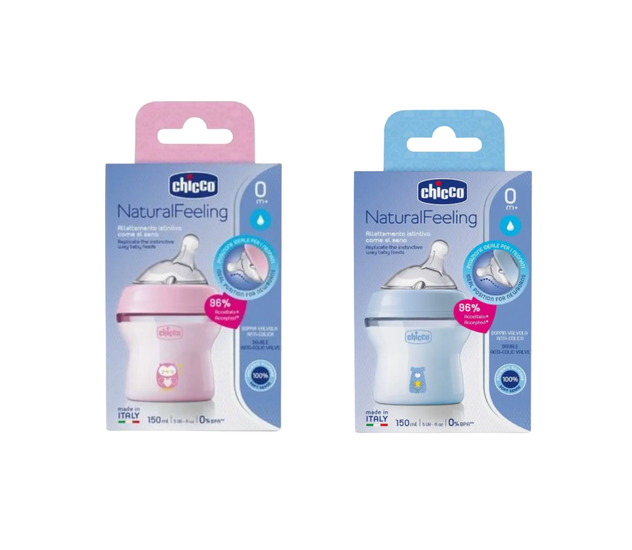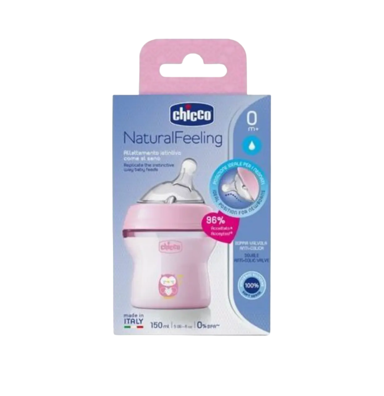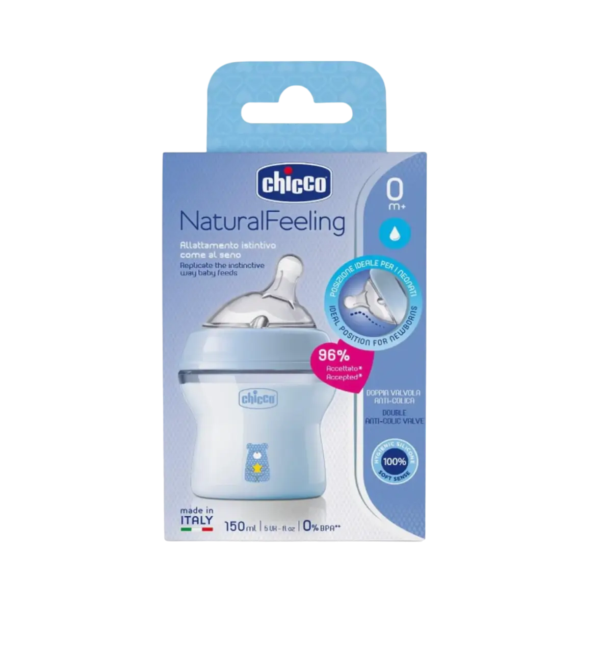 Le biberon Chicco Natural Feeling Flux Lent 0m+ 150ml reproduit la manière instinctive dont bébé se nourrit, facilitant ainsi la transition sein-biberon.