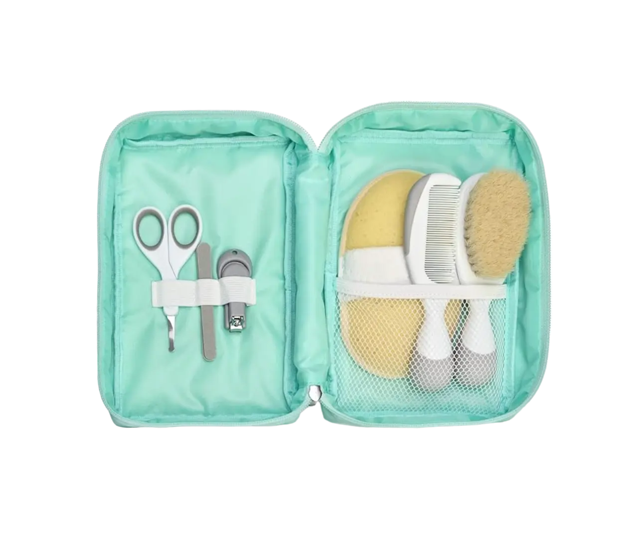 Elle comprend une brosse à poils naturels et un peigne, un gant éponge, des ciseaux à pointes arrondies, un coupe-ongles et des limes jetables, le tout soigneusement rangé dans une seule pochette pratique.