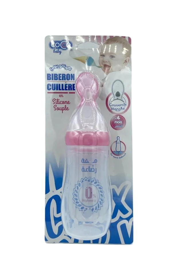 Le biberon cuillère en silicone souple Cocco est spécialement conçu pour faciliter les premières diversifications alimentaires de bébé, à partir de 4 mois. Grâce à son embout en forme de cuillère en silicone extra-souple, ce biberon innovant permet de donner des purées lisses, compotes ou céréales liquides tout en douceur, sans confusion entre succion et alimentation à la cuillère.