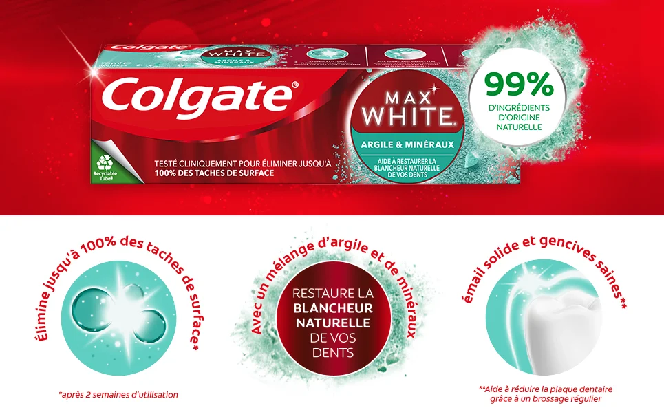 Colgate Dentifrice Max White Blanchissant est un dentifrice à base d’ingrédients naturels, conçu pour blanchir les dents en douceur et éliminer 100 % des taches de surface.