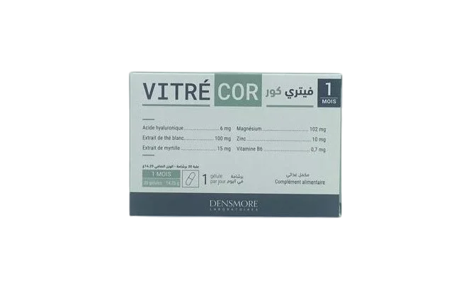 Le Densmore Vitrécor Confort Visuel est un complément alimentaire spécifiquement formulé pour améliorer le confort visuel et préserver la santé oculaire. Il s’adresse particulièrement aux personnes souffrant de fatigue oculaire, de troubles liés à l’âge (comme la dégénérescence du corps vitré ou les corps flottants) ou exposées régulièrement aux écrans.