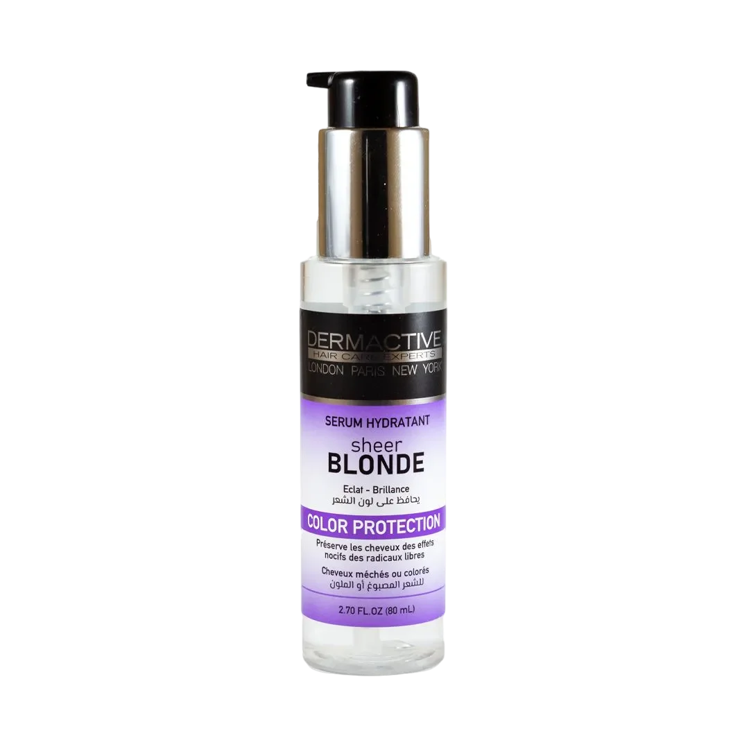 Le Sérum Sheer Blonde Hydratant de Dermactive est un soin spécialement formulé pour entretenir, hydrater et raviver l’éclat des cheveux blonds, qu’ils soient naturels, méchés ou décolorés. Grâce à sa formule douce enrichie en agents hydratants et protecteurs de couleur, ce sérum aide à préserver l’intensité du blond tout en apportant souplesse, brillance et protection thermique.