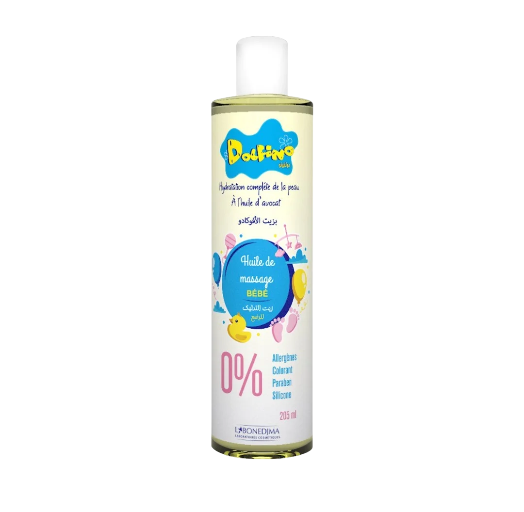 Dolfino Huile de massage pour bébé riche en huile d’avocat permet une hydratation complète de la peau du bébé en particulier les plus fragiles ou sensibles.
