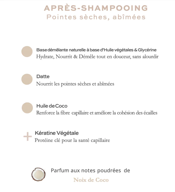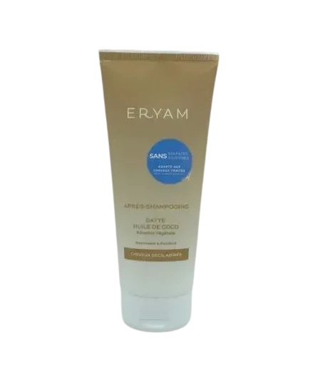 Après le shampooing, appliquer une noisette d’après-shampooing sur les longueurs et pointes, laisser poser 2 à 3 minutes, puis rincer abondamment. Pour des résultats optimaux, utiliser avec le shampooing Eryam Dattes & Huile de Coco.