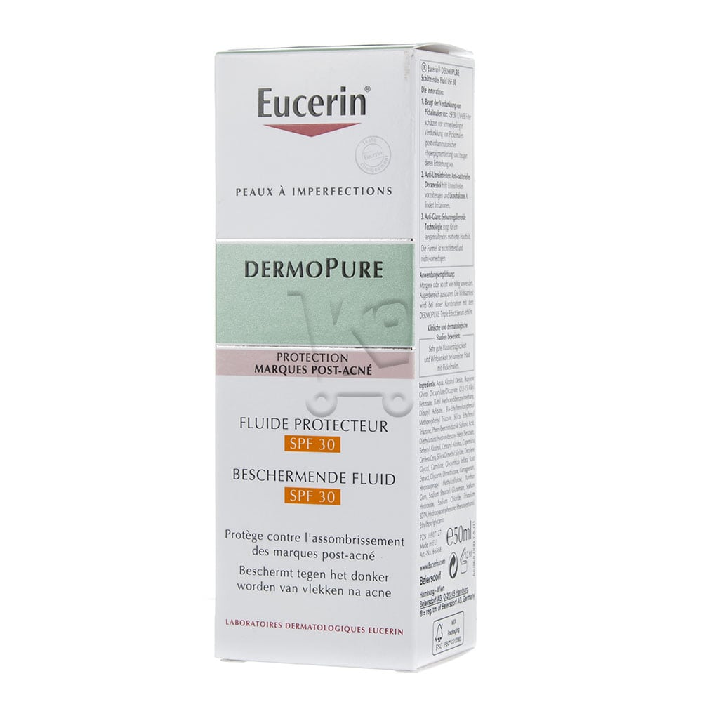 Eucerin Dermopure Fluide protecteur SPF 30 permet enfin de lutter efficacement contre les imperfections et les marques de boutons grâce à trois actions clés: