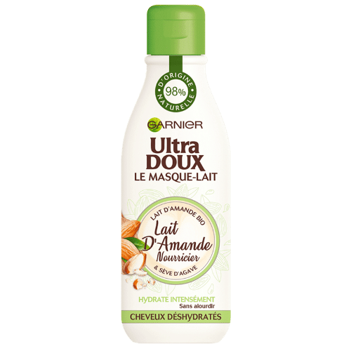 Masque-Lait Garnier Ultra Doux au Lait d’Amande bio et à la sève d’agave bio pour cheveux déshydratés.