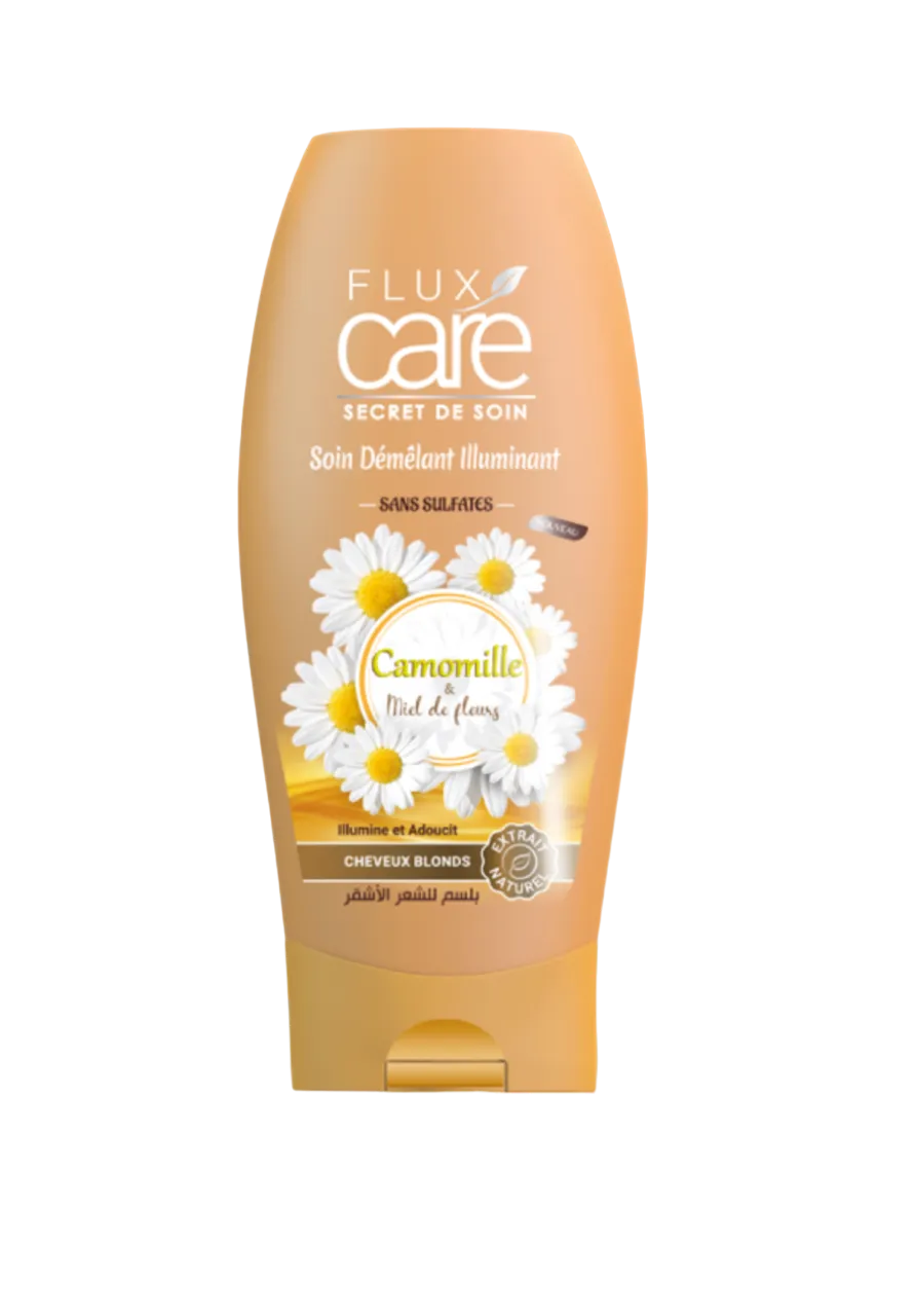 Le Soin démêlant illuminant Flux Care associe la Camomille, reconnue pour ses propriétés éclaircissantes et adoucissantes au Miel de Fleurs réputé pour ses vertus nourrissantes.