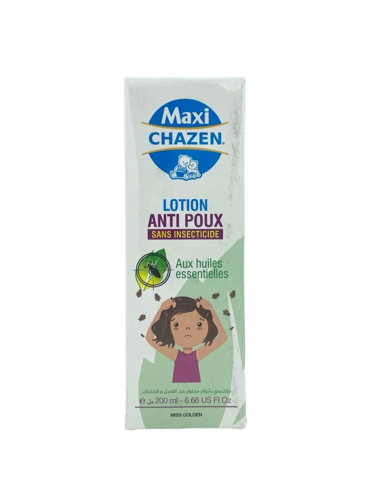 Maxi Chazen Lotion Anti-Poux Huiles Essentielles 200 ml est une solution naturelle conçue pour éliminer efficacement les poux et les lentes tout en respectant le cuir chevelu. Formulée à base d’un complexe d’huiles essentielles sélectionnées pour leurs propriétés purifiantes, assainissantes et protectrices, cette lotion agit en douceur tout en garantissant une action anti-poux redoutable.