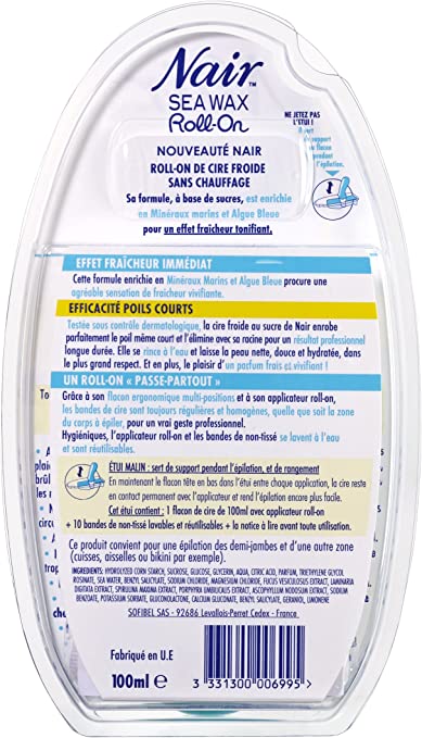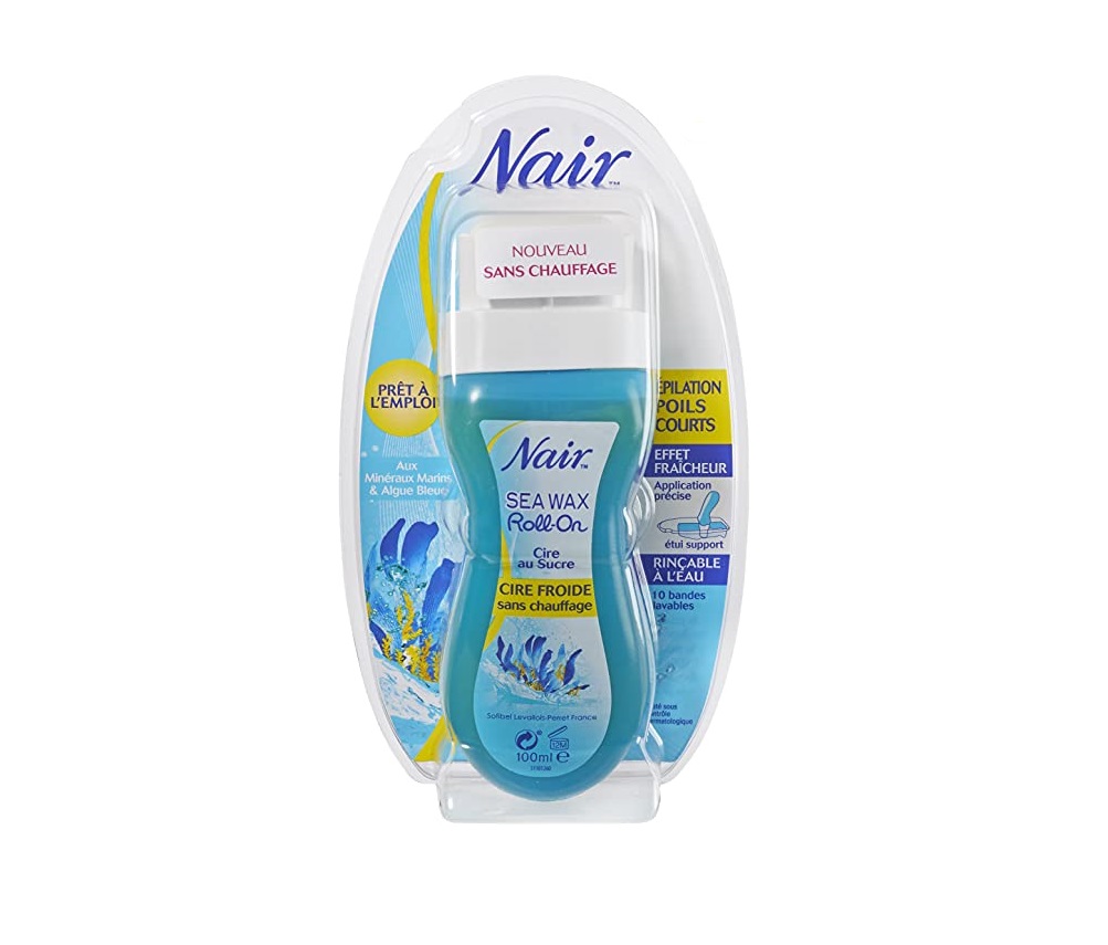La nouveauté Nair roll on de cire froide sans chauffage, sa formule, à base de sucres, est enrichie en minéraux marins et algues bleues, pour un effet fraicheur tonifiant.