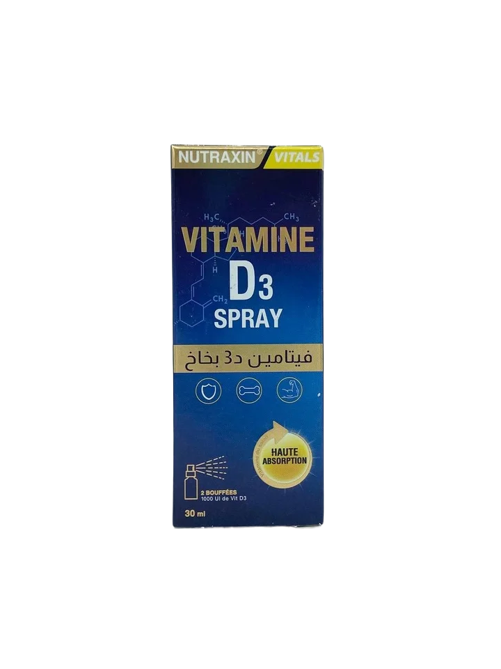 Le spray Nutraxin Vitamine D3 en flacon de 30 ml est un complément alimentaire sous forme de spray buccal. Il contient de la vitamine D3 (cholécalciférol) à raison de 1000 UI (environ 25 µg) pour 2 pulvérisations (2 bouffées).