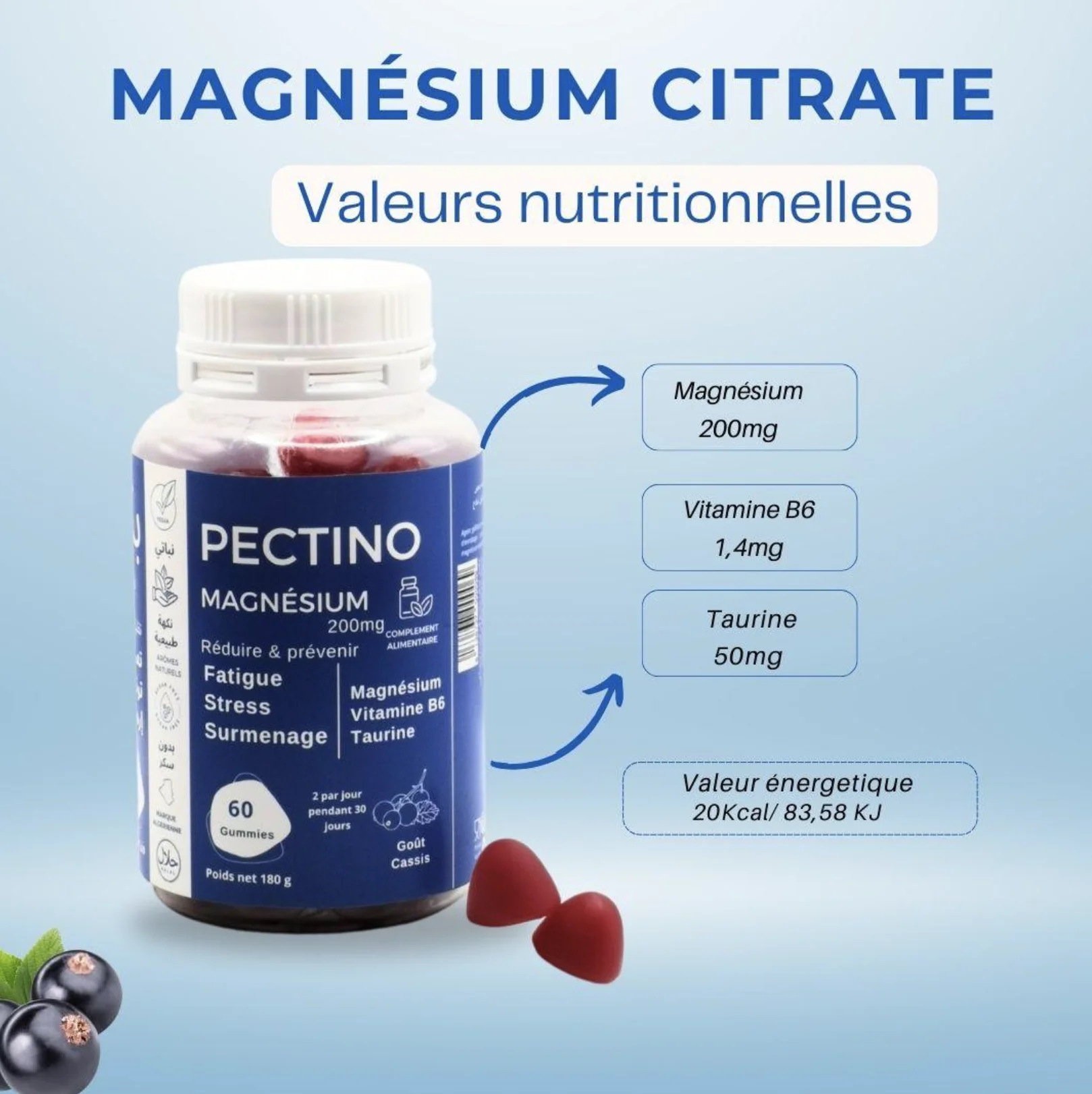 Pectino Gummies Magnésium 200mg – Goût Cassis – 60 Gummies