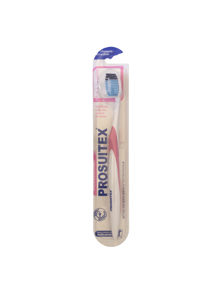 La brosse a dents Prosuitex Soin & Sensibilité a été conçue pour les personnes sujettes a des sensibilités dentaires.