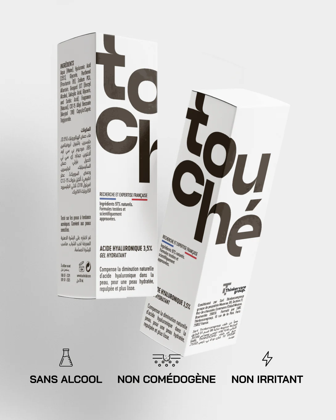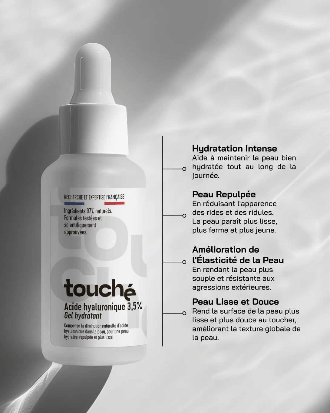 Découvrez le Touché Gel Hydratant Acide Hyaluronique 3,5%, un soin concentré spécialement formulé pour offrir une hydratation instantanée et durable.