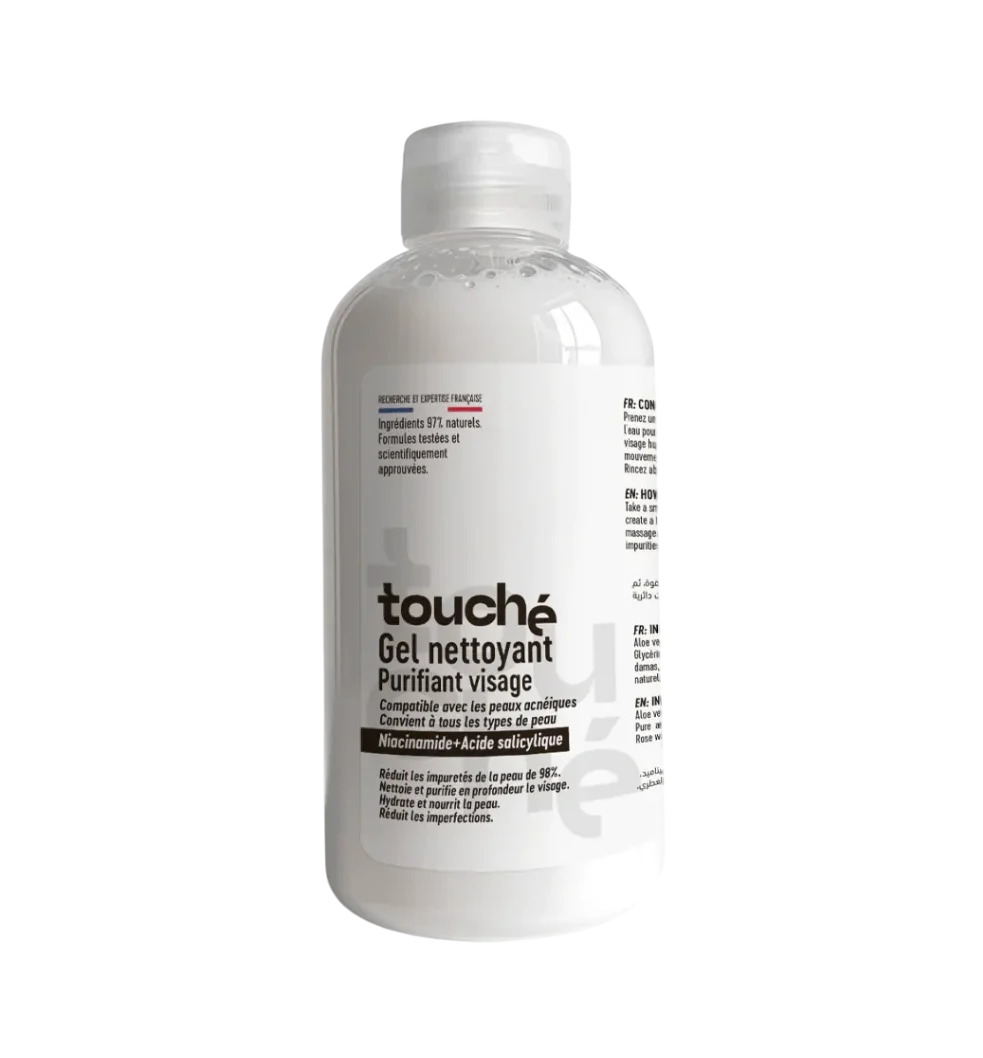 Touché Gel nettoyant purifiant à base d’acide salicylique et de niacinamide est un gel nettoyant formulé pour purifier la peau en profondeur, éliminer les imperfections et restaurer son éclat naturel.