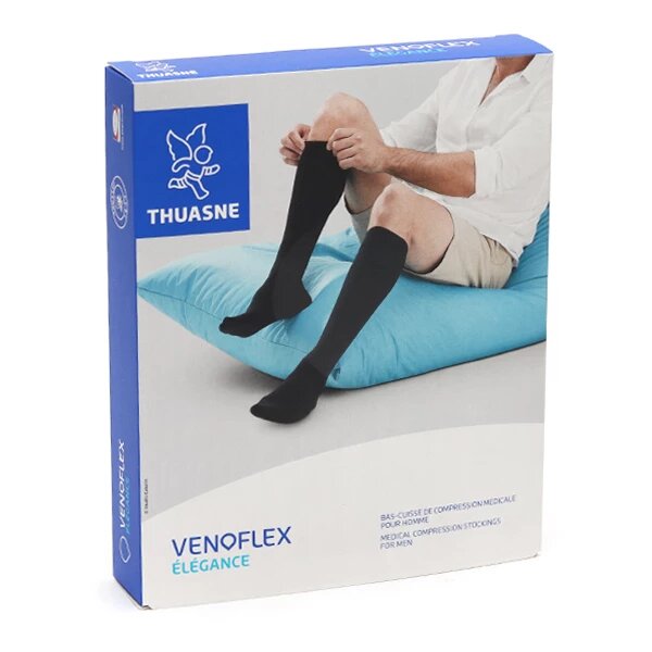 Les bas-cuisses de compression Venoflex Elegance de Thuasne disposent d’une compression de classe 2, et ont été spécialement conçues pour les hommes.