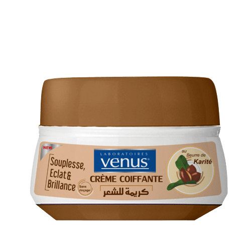 Utilisez la crème coiffante , conçue par Les Laboratoires Vénus. Au Beurre de Karité, nourrit intensément vos cheveux et leur procure éclat et brillance.