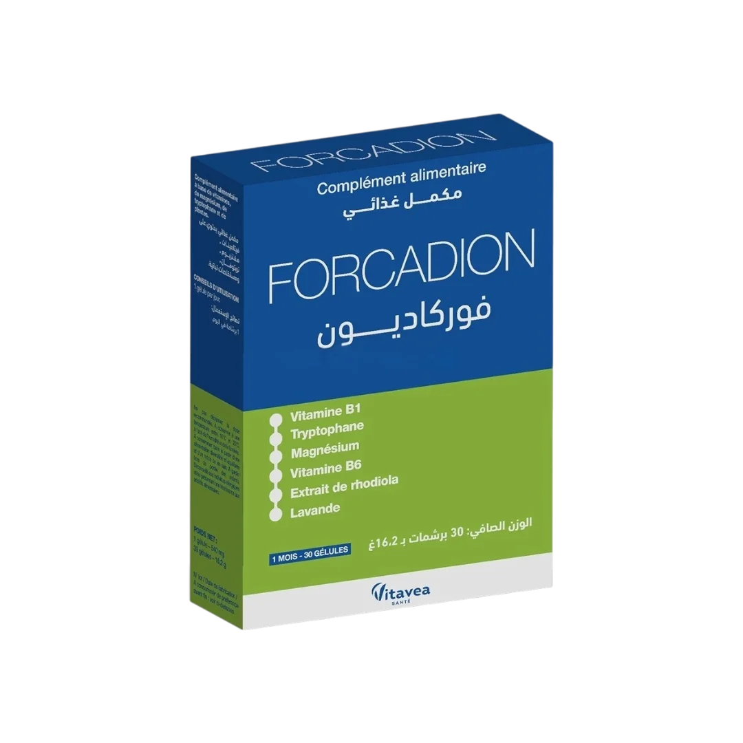 Vitavea Forcadion est un complément alimentaire à base de vitamines, de magnésium, de tryptophane et de plantes.